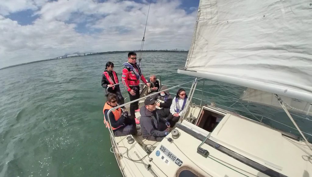 初心者とベテランが、目が見える人と見えにくい・見えない人が、一緒にヨットでブラインドセーリングを楽しんでいます。
