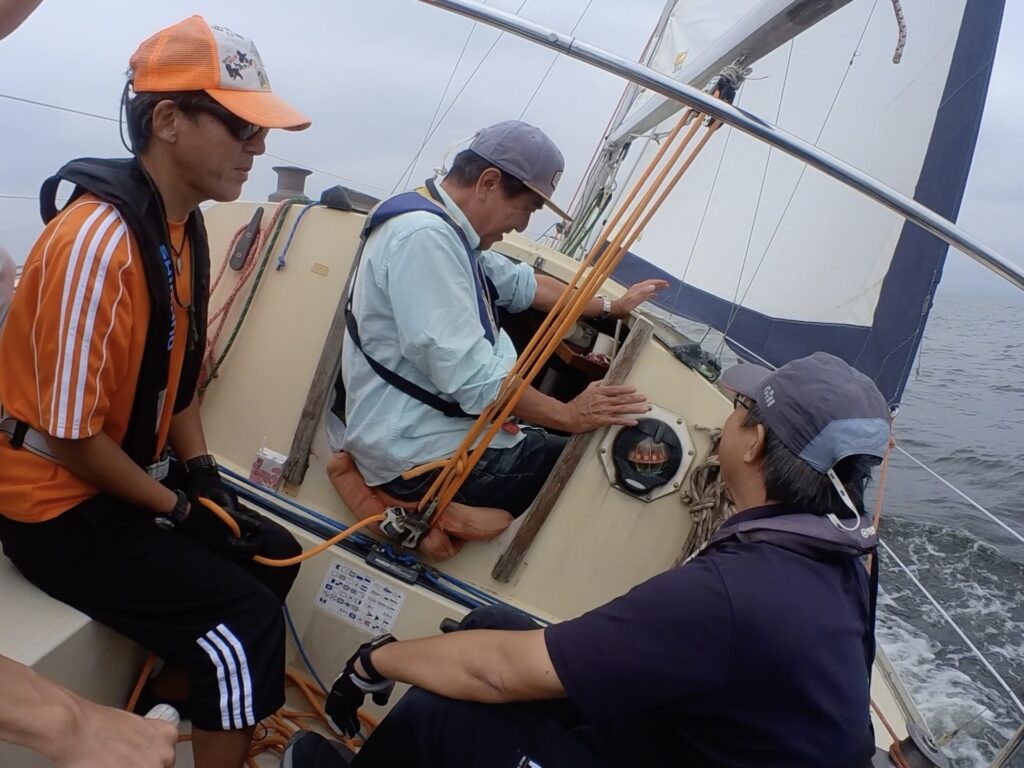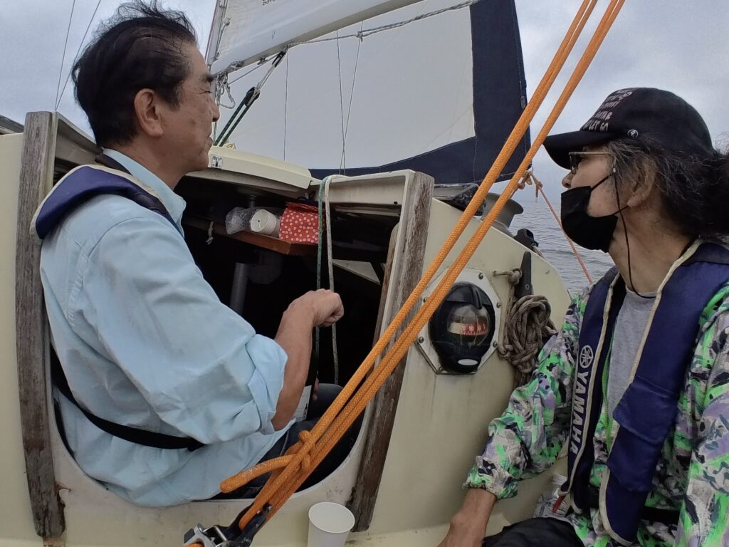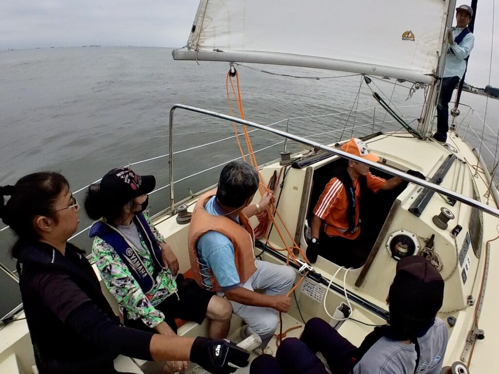 沖に向かってシブセールを張ります。そしてエンジンストップ。風と波の音だけ漂います。『風の力だけで走ってるのですね。』と体験者さんお二人、圧巻の様子。『こんなに傾いて沈まないんですか。』の問いに、とのがいちさんが『船底にキールと言う板状があって、それが重く、起き上がりこぼしのようにヨットを立て直して、沈む事は無いんです。』との答えていました。ヨドとが傾いて、乗員が投げ出されることもあるので、注意していきましょう。