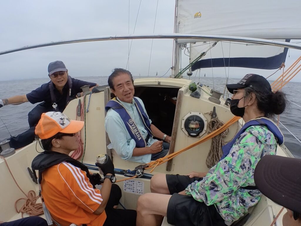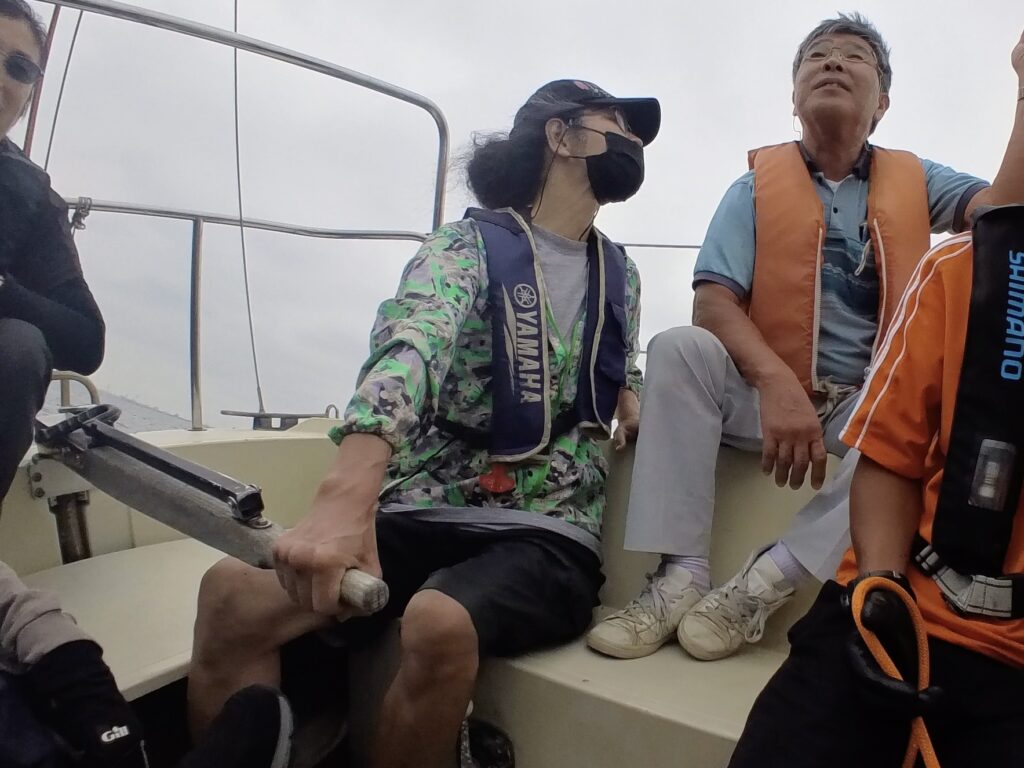 ここは仲良く、ティラーとメインシートの息を合わせていきます。そえださんと、とのがいちさんのアドバイスのもと、くるくると回ることができました。チーム一丸となる楽しさ、ヨットが自由自在に操れる楽しさ。『楽しい。』と思わず声が出てしまいました。