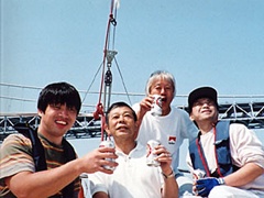 午前10時15分、私たちは、今治に行くときに列車で通った瀬戸大橋を通過しました。そこで例のごとく、瀬戸大橋を通過する前と後に記念の祝杯を挙げました。