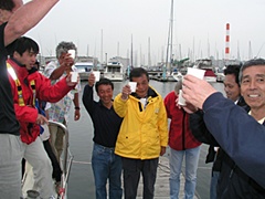 竹脇ヘルムス、村井メイントリム。グッドバランスな船とベテランセーラーの指導で強風のなか、実に安定した走り。9時方向にディズニーランド、ときおり羽 田に下りるジャンボ機の迫力あるエンジン音も豪快だ。お台場の風車は、あれはオランダだ、とだれかが言う。振り返れば東京タワーと高層ビル群、あそこは ニューポート。おっ、あっちには椰子の木、あれはハワイだ。竹内さんがときおり、海はあくまでコバルトブルー!と叫ぶ。もちろん初セーリングのビールの乾 杯は忘れていない。次はワイン!。ソムリエ村井もご満悦。