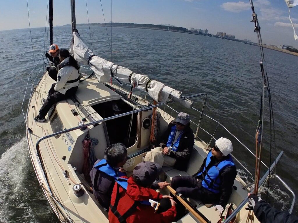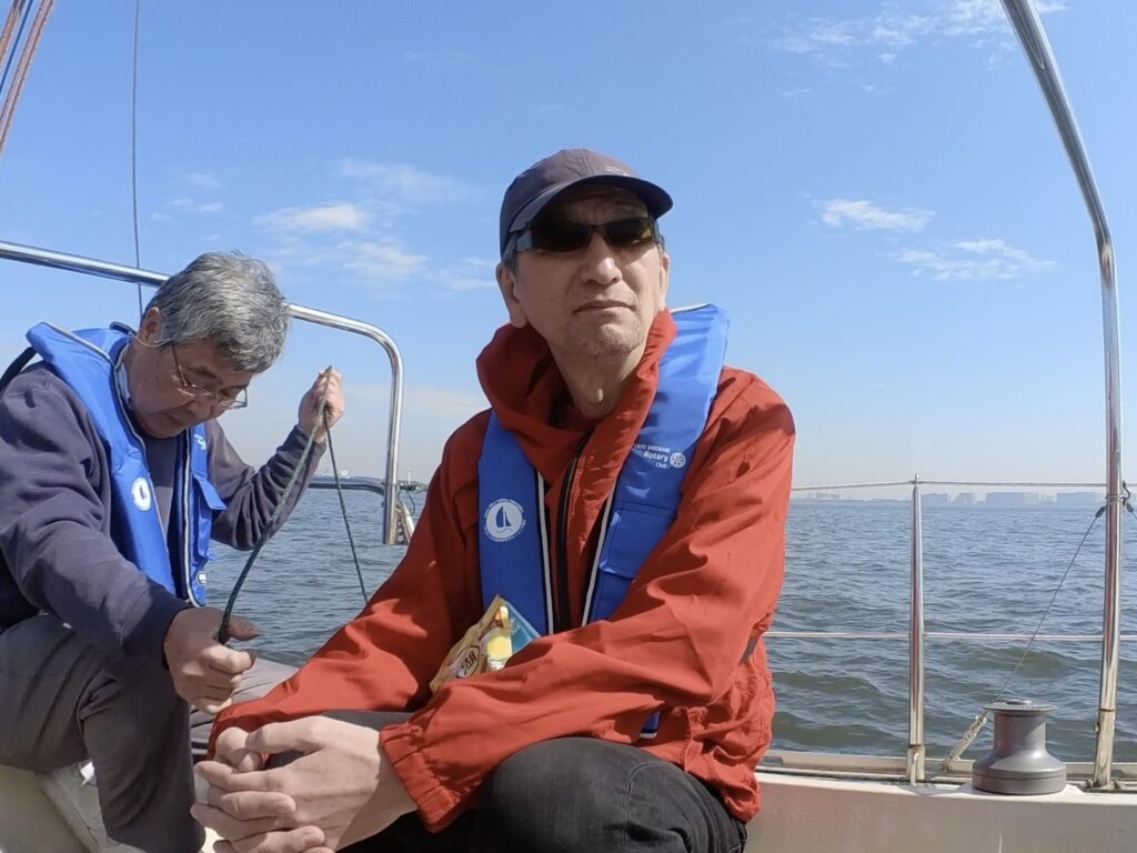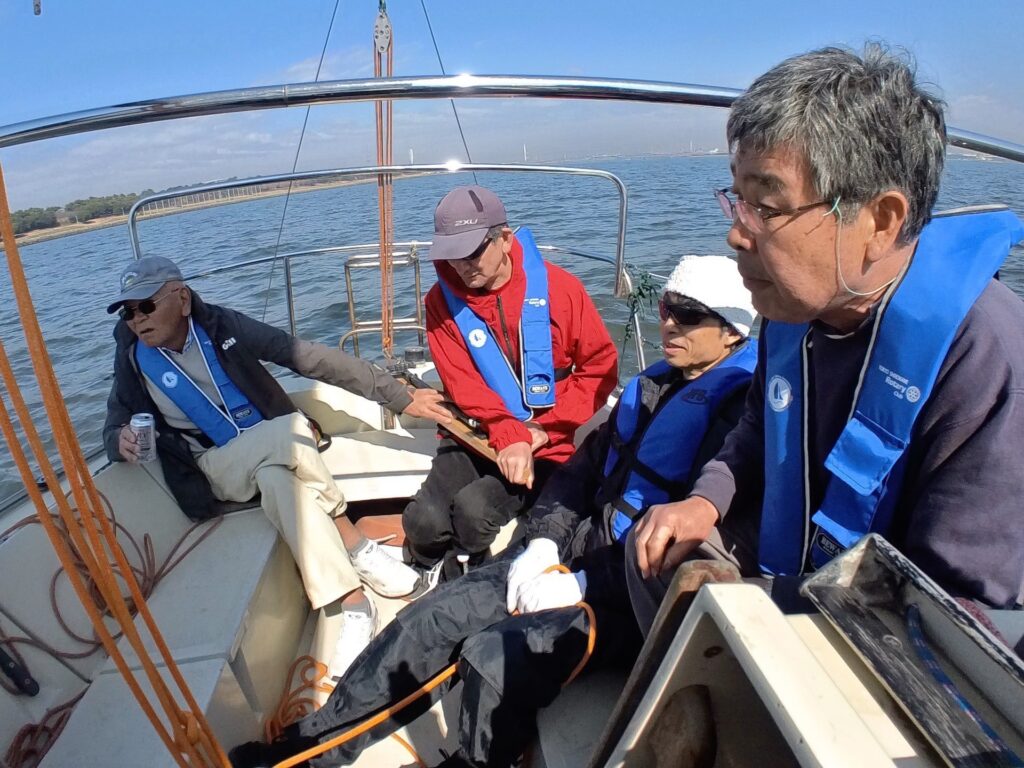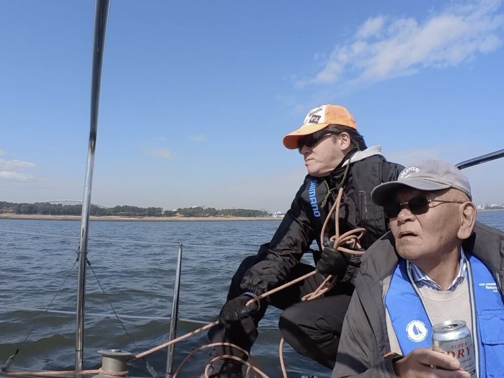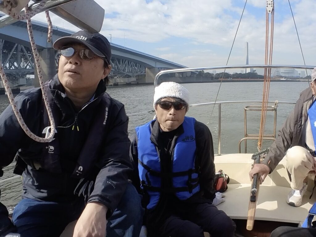 エンジンを切ってセーリング開始。のはずが蝉の鳴くようなッビビビッ!の警告音。エンジン?ウォーターポンプ?私にはわかりませんでしたが、不具合のようです。児玉さんがチェックして、すぐに改善。改めてセーリングのスタートです。ティラーは長谷川さん。長谷川さんと言えばマラソンランナー。今日は東京マラソンの日でしたが、あいにく抽選漏れで『なかなか当選しないよ。』と、今日はヨットでランニングです。風速、約2メートル。弱いながらも順調に進んでいきました。