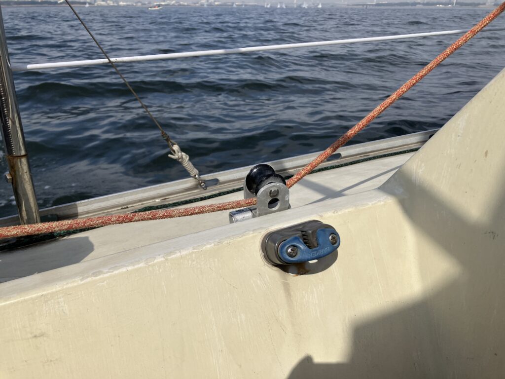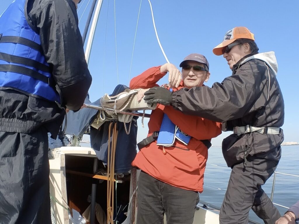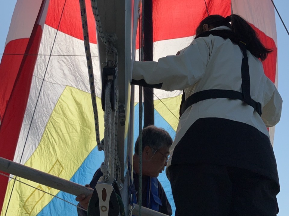 ゲストバースから沖へと、児玉さんの機帆走で向かいます。早々とメインセール、ジブセールを上げます。