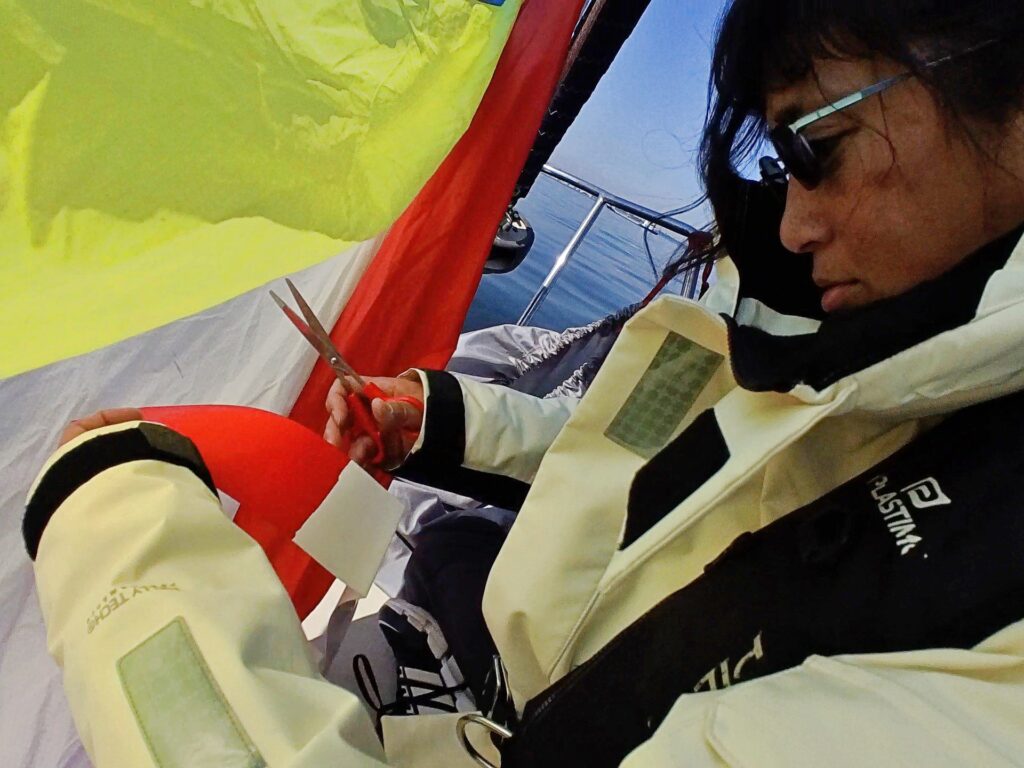 スピンのセールをしまう際、破けの補正を行いました。赤白と派手なスピンはそれに合わせた補強用テープがあるのです。副田さん協力のもときれいに貼ることができました。うんと、綺麗です。これでまたレースも楽しみです。