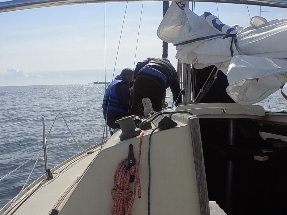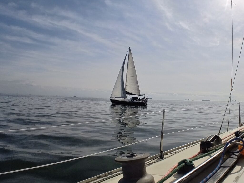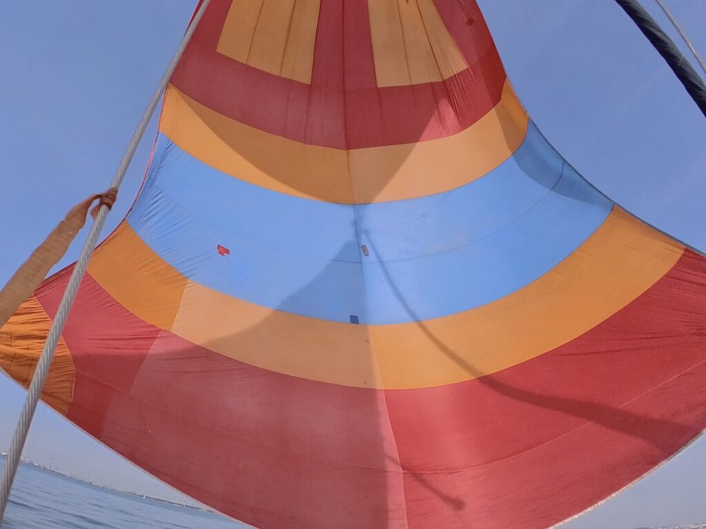 少し風が上がりスピンをおろし 上り、タックの練習、児玉さんの艇の前で私のタックの変な動きを披露。