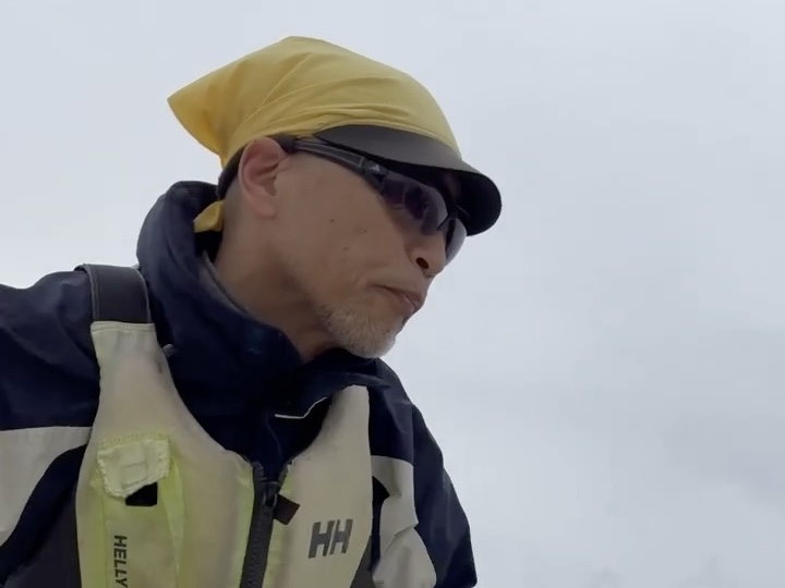 私からみてシモ側に座っている古庄さんは、カッパのフードをなんとかかぶろうとしているが、強い風で後頭部へまわってしまい、なかなかかぶれない光景が、もはやコミカル。
