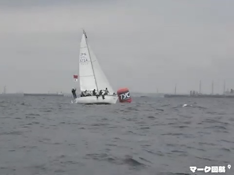 あほうどりは何度もブローチングしながら大きくポート側へきりあがり、スピンシートをだしてなんとかたてなおし、すぐにシートを高速で引き入れ、またブローチングし、フィニッシュマークの左側へ入るのがぎりぎりのライン。