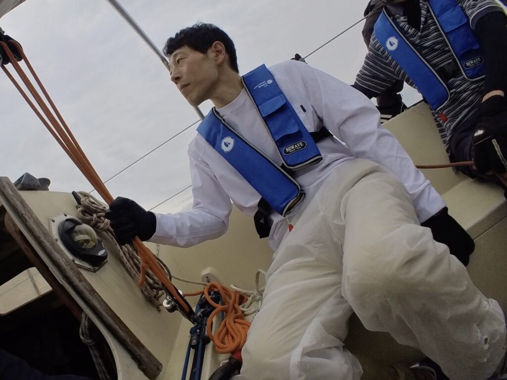 沖に出て、ジブセールのみで走行開始です。前回の定期活動同様、軸がバウ側になるので、バランスを探る必要になります。古庄さんお見事です。
