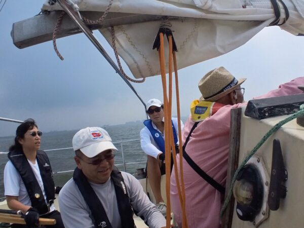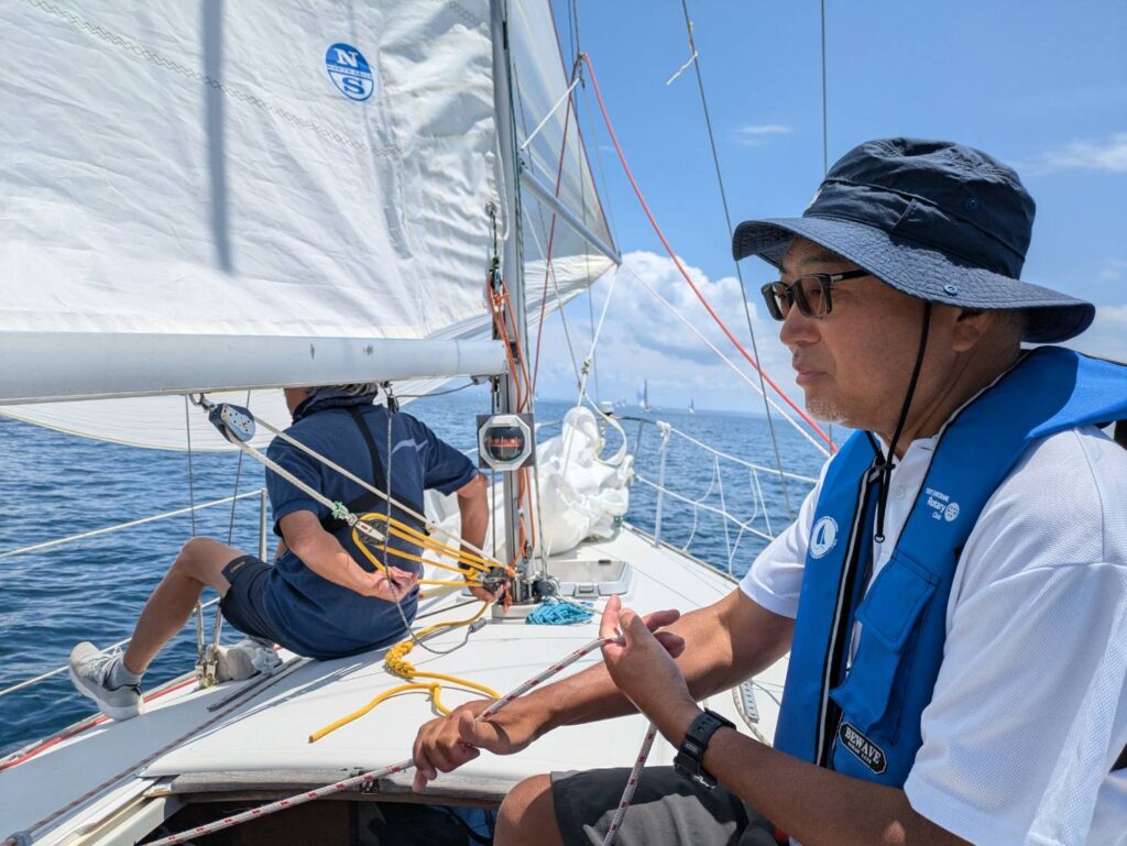 フィニッシュ後は赤白ブイまで金子がティラー練習、