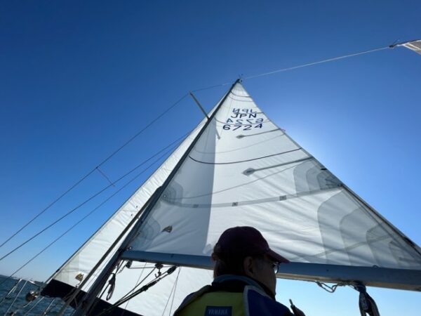 安田さんは、何をしようとされているのかを、状況とともに伝えてくださったことが、インチキブラインドを卒業しつつある私にはとてもわかりやすかった。例えばカミマークを目指しているときに、「うーん、入れるかなあ。ぎりぎり。タック入れたくないなあ。あと少しのぼりたい。」というようなことを仰るので、マークが見えない私にも、二回タックするにはぎりぎりの距離であることや、この風とスピードなら、少し速度を犠牲にしてでも、ラインに無理矢理乗せた方がいいのだなということがわかるので、風は弱かったが、メインを引き込むという判断ができた。すると、「あ、入れそう。」と仰る声が聞こえるので、私のトリムが正しかったことがわかる。