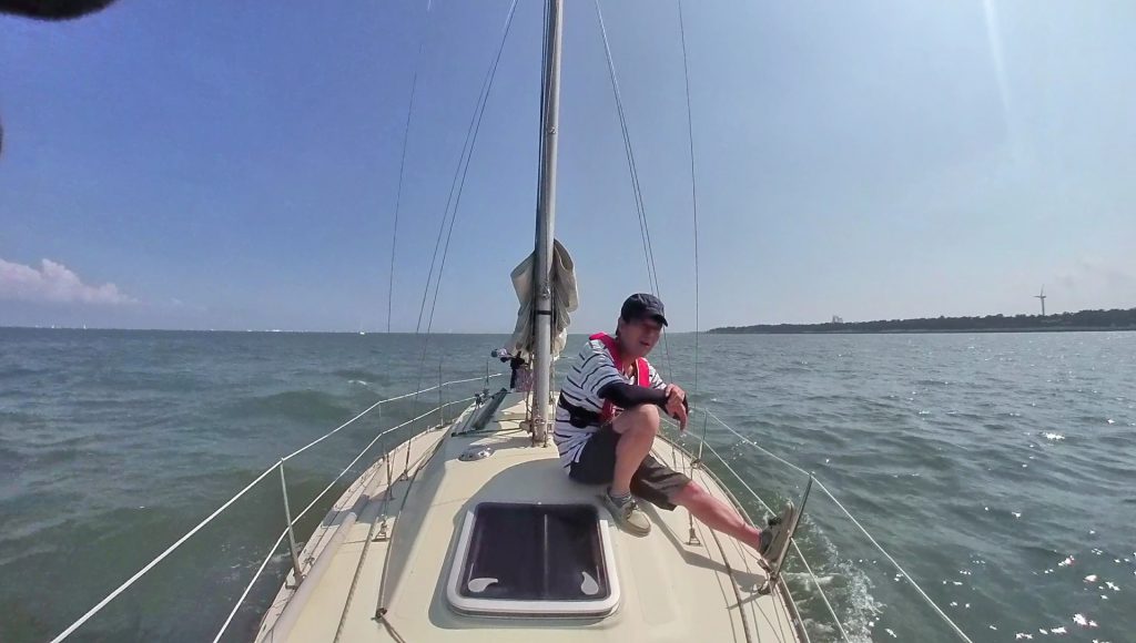 しばらく南下したのちジブも展開。2、3メートルの風に、セーリング可能であるとし、エンジンを切って静寂が訪れる。