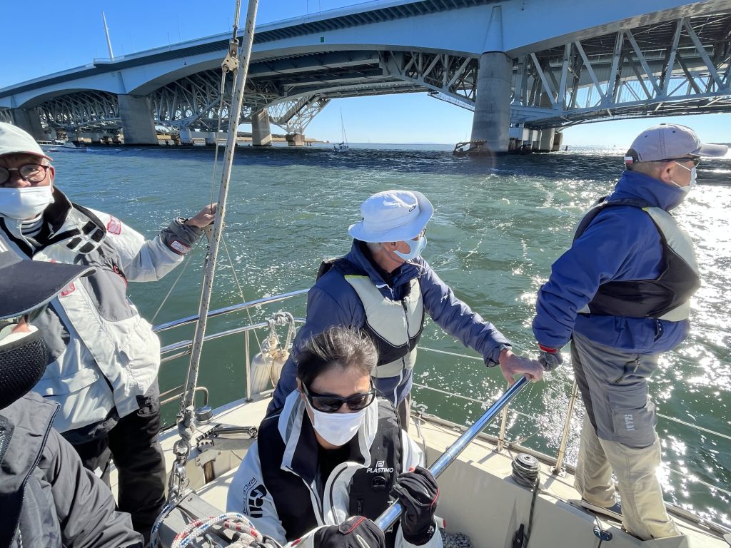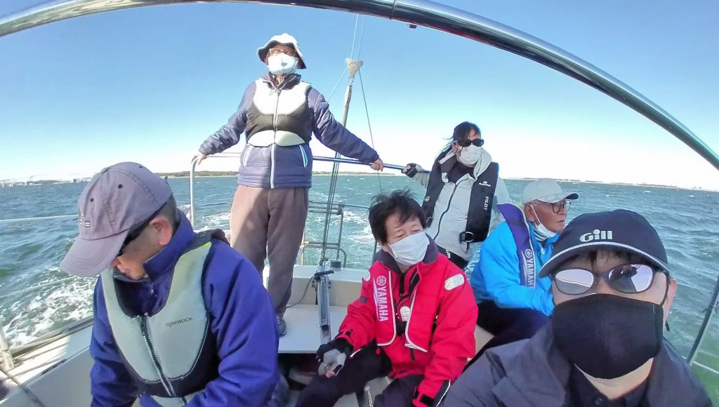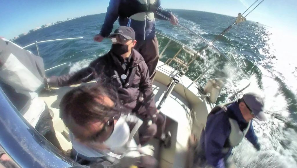強風下でのタックは、狭いコックピットではおしくらまんじゅうだ。大変申し訳ないが、竹下先生、竹内先生、児玉先生をお尻で押し退け、風上側に移動を繰り返す。
