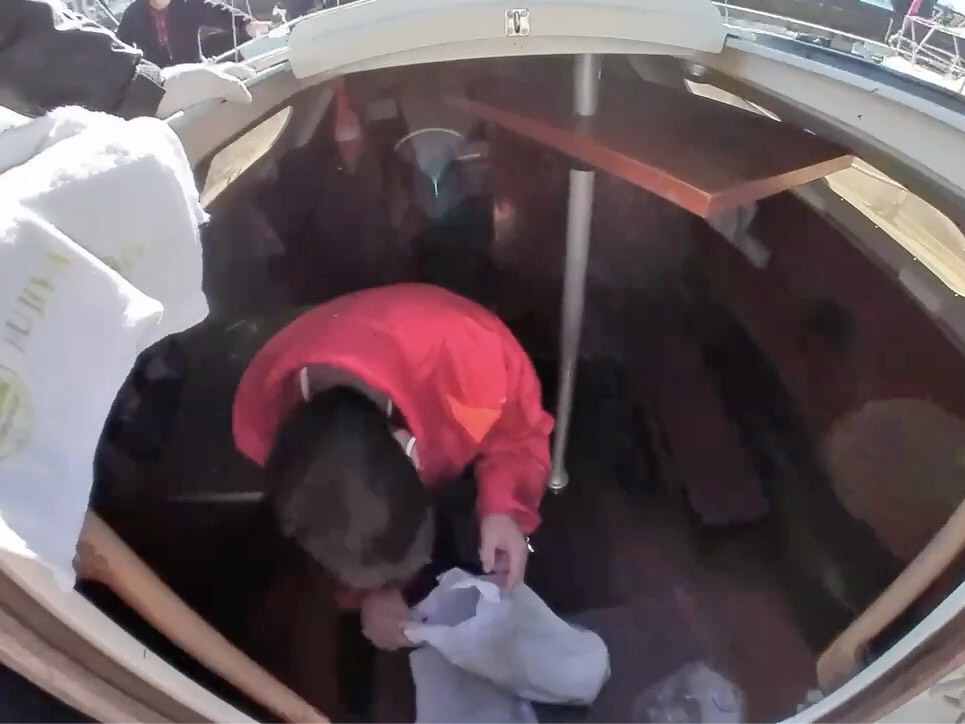 まず、船内のセール、備品、マット、食器など外に出しました。船内に収まっていたとは思えないほどの量で、あっという間にポンツーンに並べられないほどになりました。