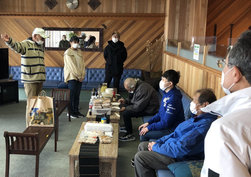 今日は体験セーリングのMさんと、協力艇のクルーのみなさんも一緒の懇親会。児玉さんの挨拶でスタートすると、机の上には持ち寄ったお酒や食べ物が沢山並んでいました。谷下田さんが富山から直送したホタルイカのお刺身、児玉さんの奥さんが朝6時から作ってくださったいなり寿司とからあげとポテトサラダ、副田さん手作りのピクルス。極めつけは、児玉さんの家にあった50年物のウイスキー!他にも、沢山のお酒やおつまみがあってどれもとても美味しく、それにつられて話もあちこちで盛り上がっていきました。