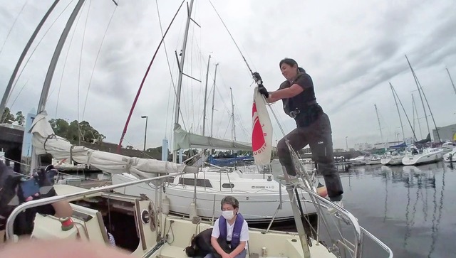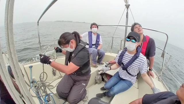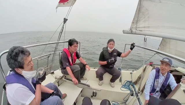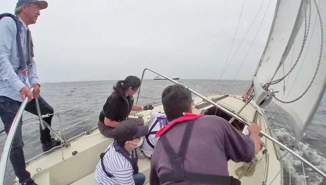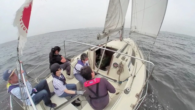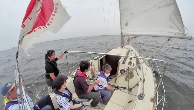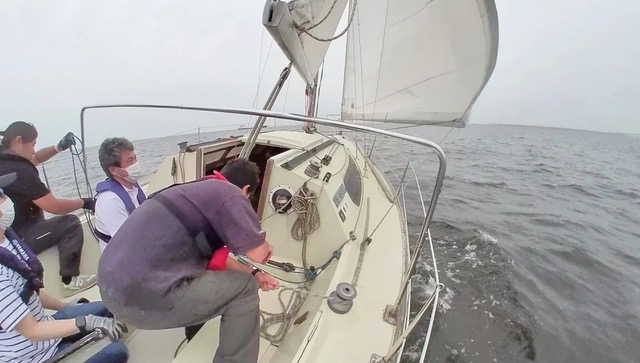 今回は1時間以上ずっとティラーを持たせていただきました。前回の練習で身につけたタックとジャイブに加え、レースをイメージしてマークを回る練習もしました。今まではティラーノ操作に精一杯でしたが、少しずつセールのタイミングに合わせて登ったり落としたりすることも考えられるようになってきました。また、村上さんに教えていただきティラーを親指と人差指で軽く持つようにしたところ、波の揺れも感じられるようになり、ティラーを細かく操作しながら調整できるようにもなってきました。ランニングで風の向きを感じるのはまだまだ難しいですが、セーリングの用語も少しずつ覚えてみなさんからいただく指示もりかいできるようになったので、それに合わせたコントロールもできるようになってきたと思います。