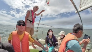 セーリングそのものは 、風が強く吹いたり 急に止んだり 忙しくありましたが、 皆さんベテランの領域で安全かつ楽しく できました。 特にブラインドの小倉さんは 風向きを肌で感じたり、 セールの音を聞き分けたりで 体験の市川さんの ティラーを 的確に操船されていました。 その凄さに驚きました。