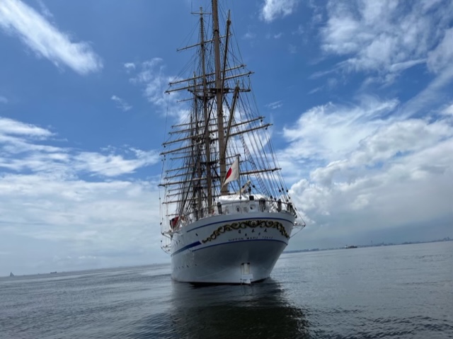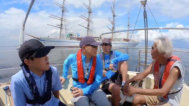 若洲沖とディズニーランド沖の間ぐらいに、日本丸がいたので、みなで集合写真を撮る。