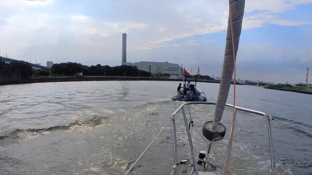 東京ゲートブリッジが見えるあたりの若洲沖付近で、1メートルぐらいの風が吹いていたため、機帆走のまま少し練習。すると、以前はなかった灯浮標がいくつかあり、その内側に警備艇が2、3隻いて、近づいてみたところ、この中には入らないでくださいと言われた。