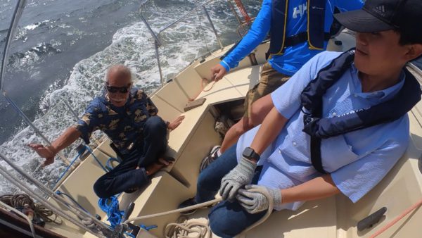 そこで今回は操船の感覚を取り戻すことを目的に、山田さんと森崎がティラーとメインシートを交代しながら、ずっと走らせました。穏やかな秋空の下(まだ少し陽ざしがつよかったですが)、アンカリングすることもなく、それぞれに持ち寄った物をシェアしながらのランチタイム。時にはシーホッパーの練習レースを観戦しながらと。久々のメンバーとの再会、のんびりとセイリングを存分に楽しみました。