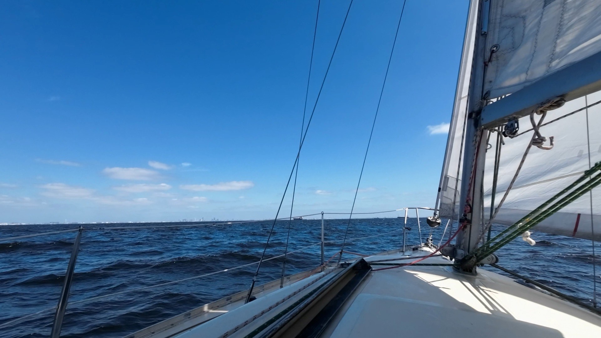その後も、順番にティラーを握る。帰路も4メートルほどの風が吹き、ギリギリまで帆走。そのくらいいい風だった。ジブを下ろし、メインを下ろして橋をくぐる。