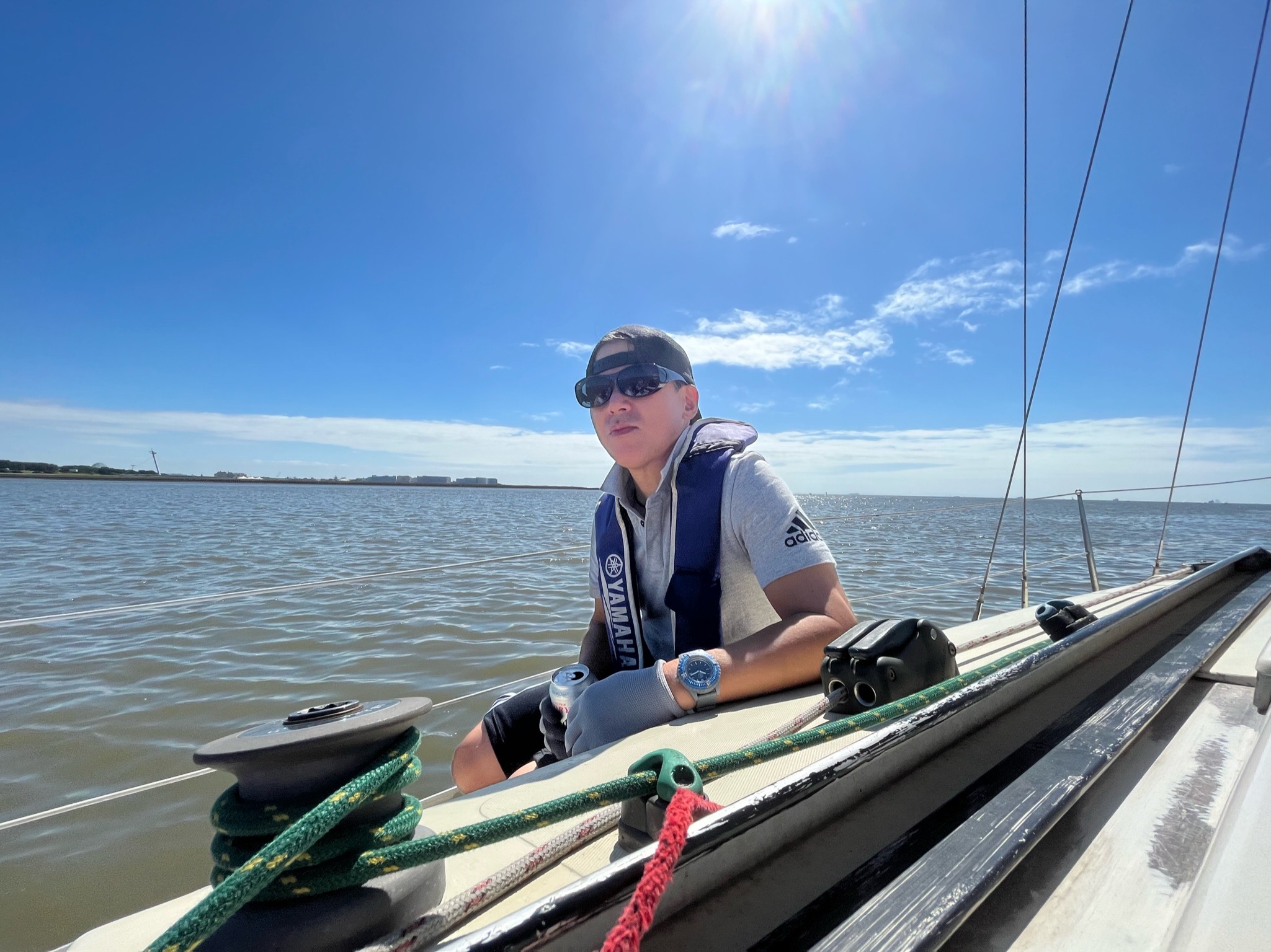 気持ちいい風を受けることができるクローズを体験してもらう時が来た。絶好の風の中、ブラインドの佐藤さんにティラーを握ってもらう。