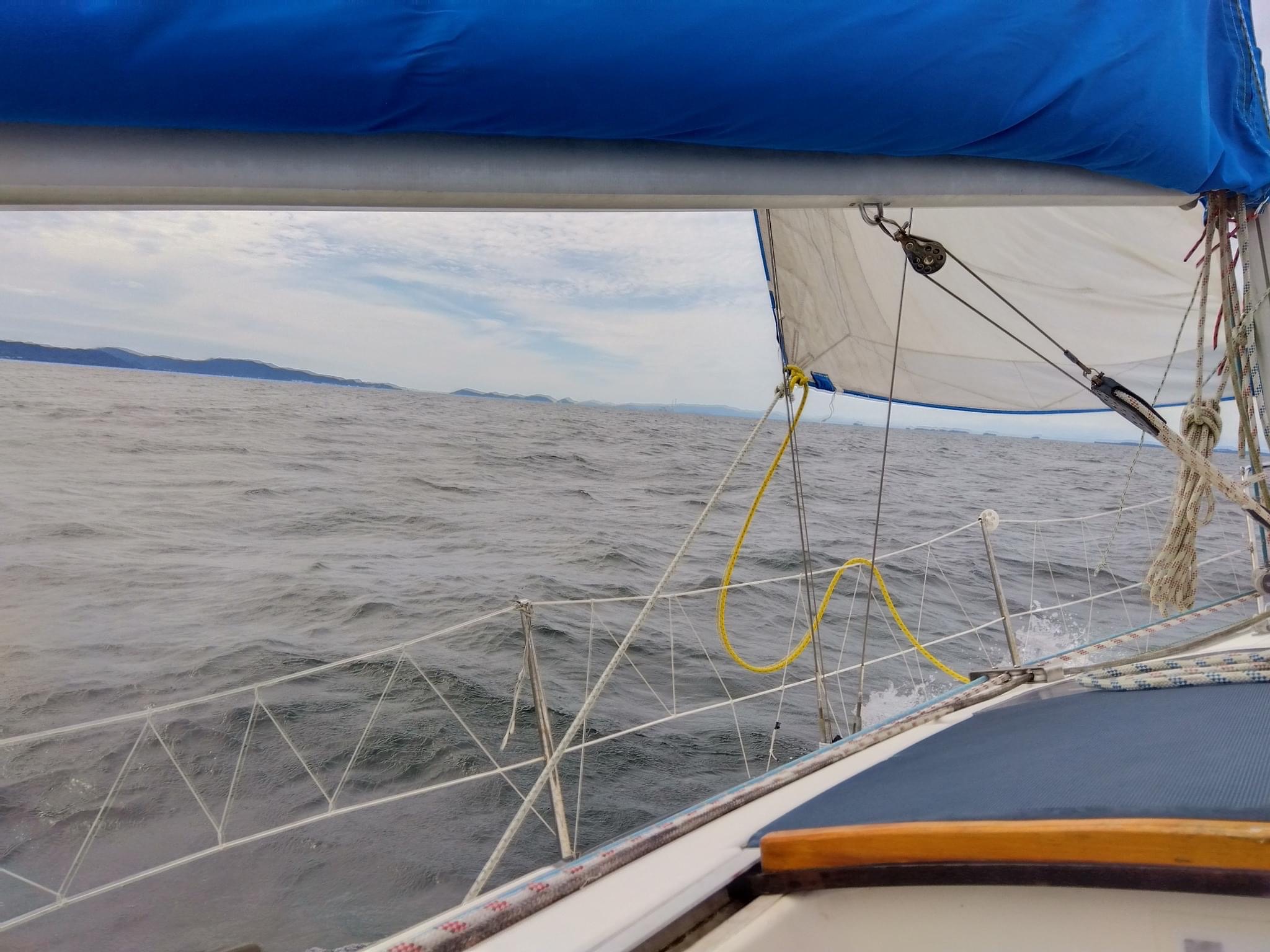 本日はこの時期の楽しみ、スナメリと遭遇することを目指して出航しました。風が予想以上に強かったためワンポイントリーフし、スナメリのビュースポットである西浦半島周辺を目指しました。