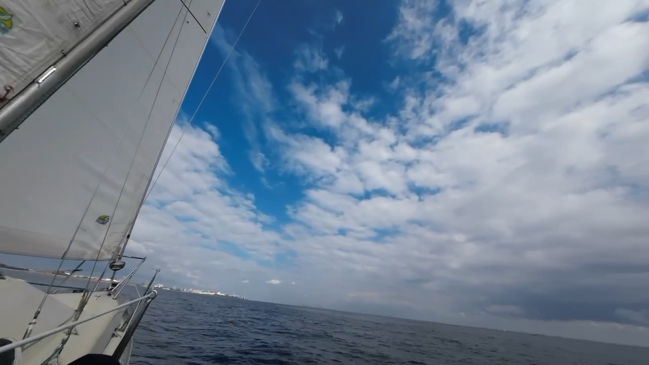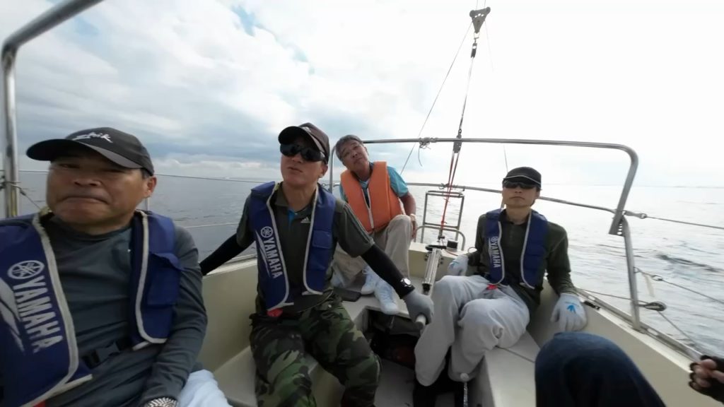 沖に出ていよいよセーリング開始。風はまずまず。水田さんがティラーを握りました。前回同様安定した操作です。安定の中にもさらにヒールが始まりました。見上げるとジブセイルもメインセイルも風を受けてパン!と力強く張っていました。特にアホウドリのジブセイルは大きいのです。その白く大きなセイルはアホウドリの翼というよりもジャンボジェット機の翼のようでした。思わず美しいと声に出してしまいました。