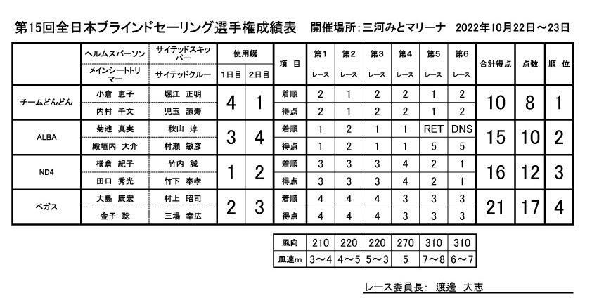 結果発表 第15回全日本ブラインドセーリング選手権(2022年)