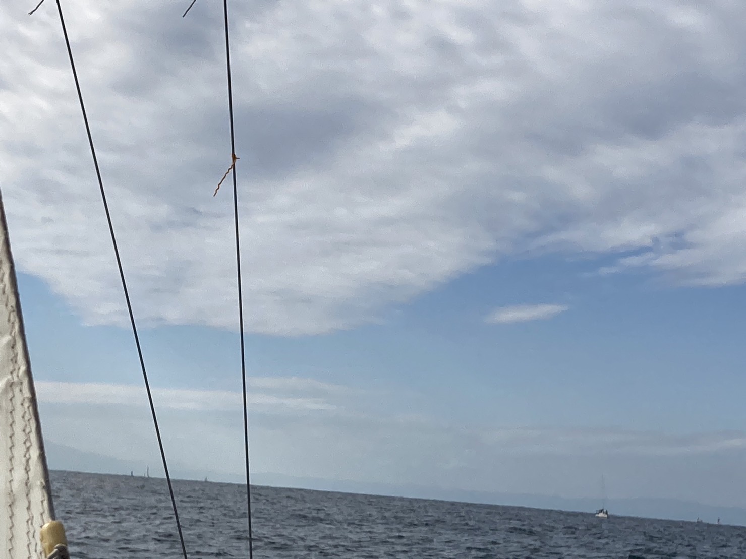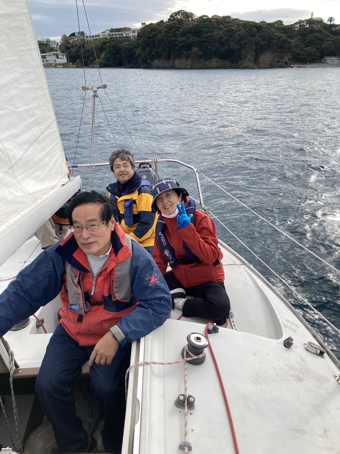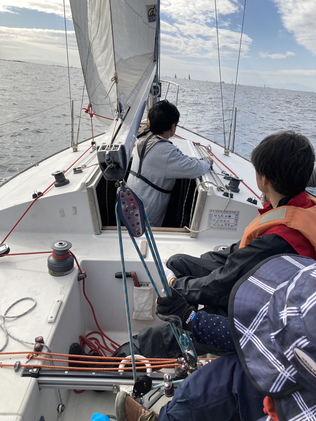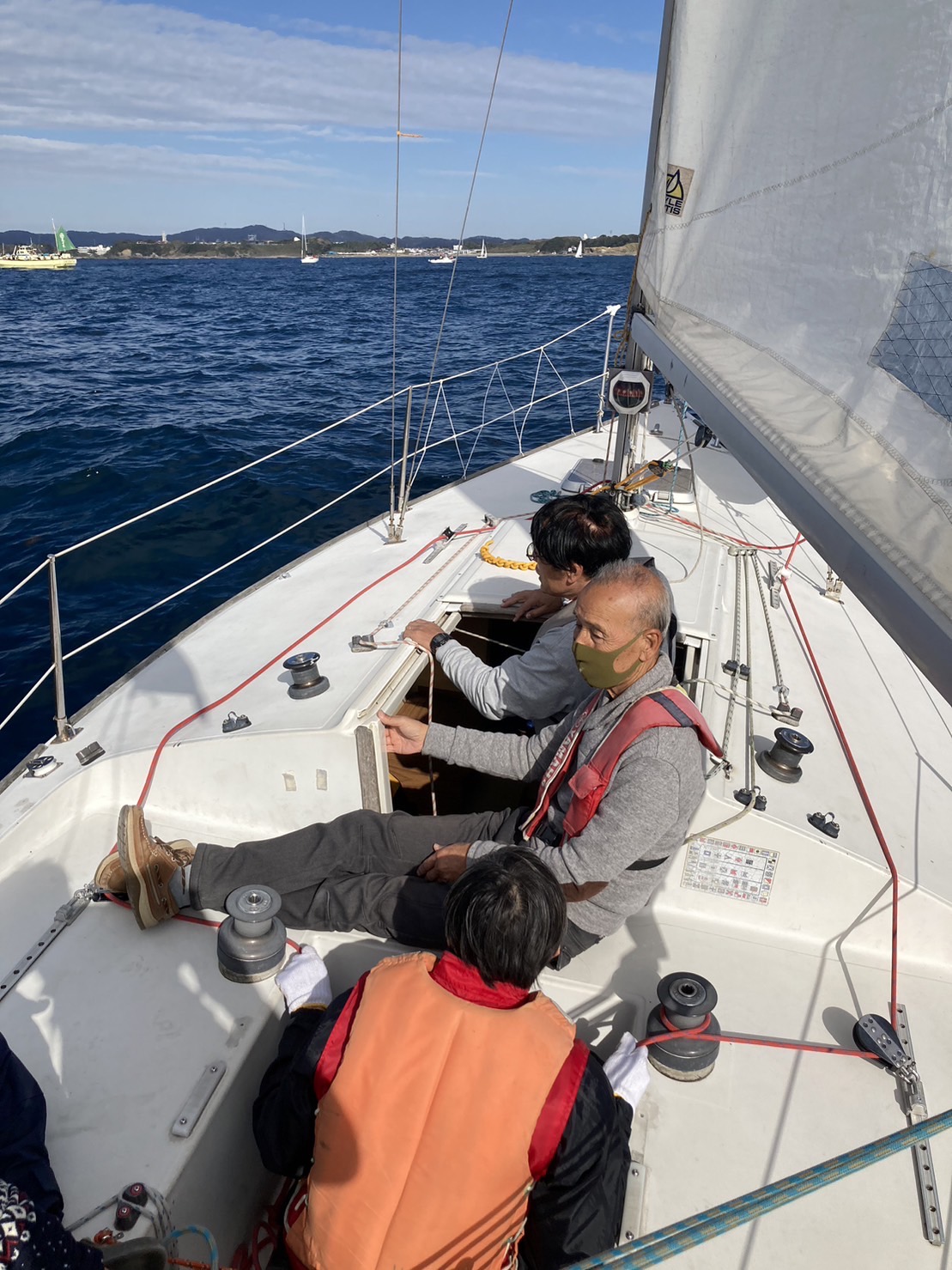 この季節にしては穏やかで暖かな日でした。その分、風は弱く比較的経験のまだ浅いブラインドにはちょうどよい天候だったと思います。しかし、以外にうねりがあり、ティラーの操作は慣れが必要な海面でした。また風が弱いため、お昼近くになると、風が回って風をとらえるのに苦労したかと思います。