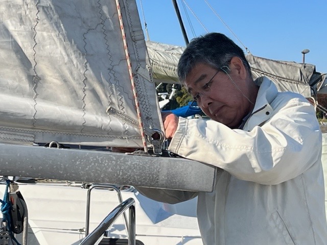 メインセールを外して艤装しなおしたとき、これが抜けないよう、蓋をする仕組みになっているのだが、蓋の位置が少しずれていたようで、古庄さんがドライバーを持ってきて、締め直してくれる。