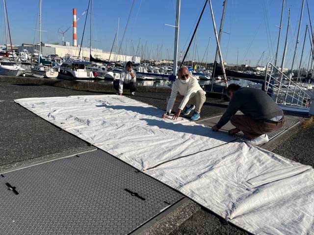 ずっと見上げるだけだったあほうどりのメインセールは7メートル以上あり、とても大きく感じてきたが、地面に置いてみると意外に小さく、ああ、自分ももう、百数十回あほうどりに乗ってきたのだなあと、先輩会員の皆さまの足元には及ばないものの、少々の感慨にふけった。