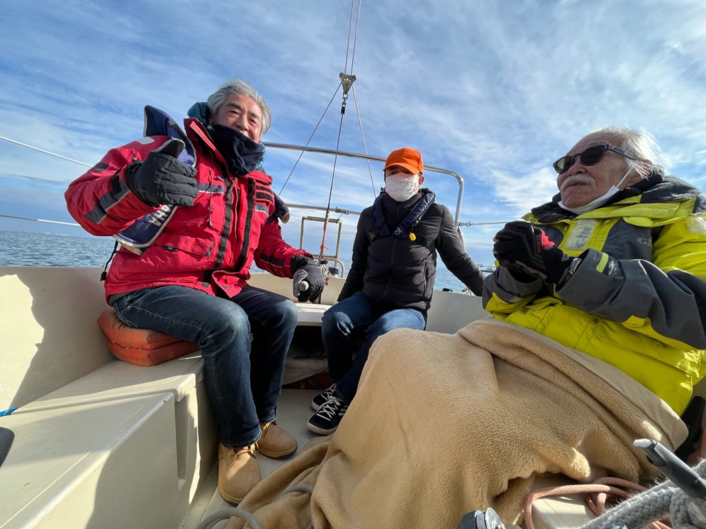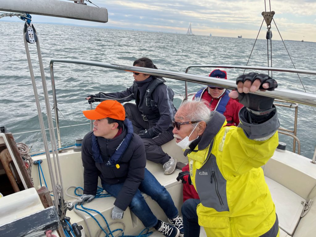 出港から2時間以上ティラーを握り続けていた、そえだ船長。風がアビームからクローズに変わり私がティラー練習することになりました。今回私はティラーの握り方を少し変え指先から肘までティラーに触れるよう操作してみました。そえだ船長のご指導から、その方法がうまくいきました。詳しいことはまだわからないのですが「センターポジションが掴めるようになりました。1段階上達しました。」と、言葉をいただきました。嬉しさからの充実感です。