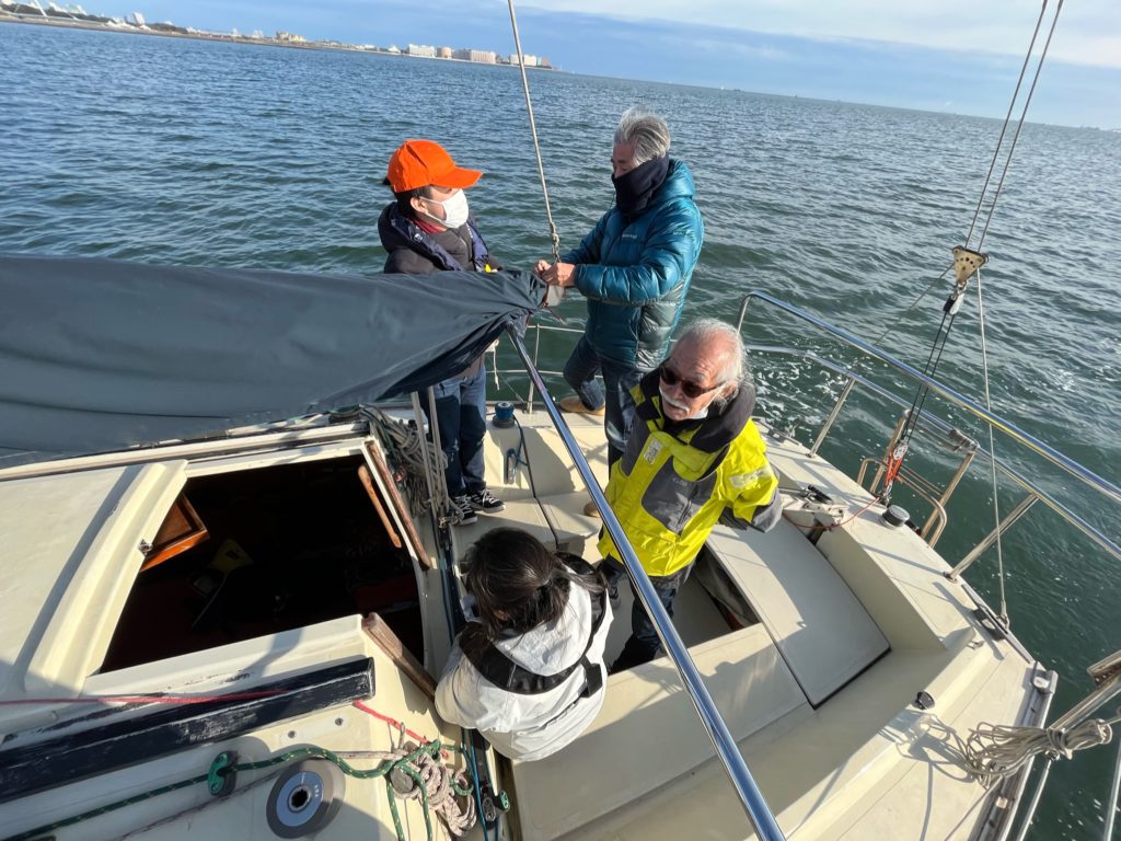 荒川河口の陸橋潜り沖に出たらエンジンを切り即セーリング開始です。北風の難しいランディングからジブセイルは右、メインセイルは左の観音という特別なセーリングとなりました。観音という技は後ろから風が来るので走行方向と重なり風を感じづらいのです。合わせてティラーの角度が10度以下。それ以上切りすぎるとセイルがばたつきブームが返ってしまい危険性も高くなります。ここは、そえだ船長がそのままティラーを握ることになりました。その難しい技をなんとか少しでも習得しようと私もティラーを軽く触らせていただきました。微妙な細かい操作の連続でやはり難しさは否めません。そえだ船長は涼しい顔で操作していましたが本当に難しいのです。