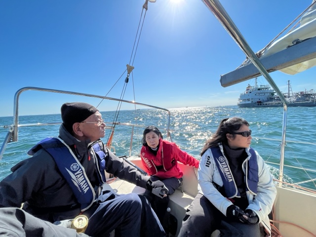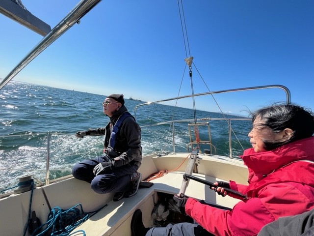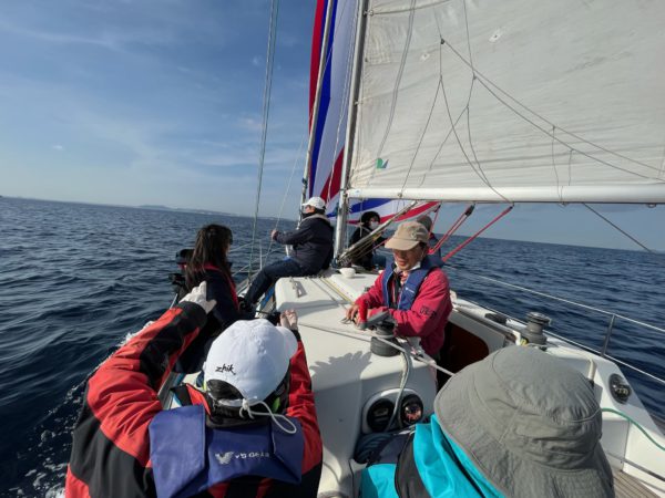 小倉さんがティラー、とのがいちがメインセールトリマー、そえださんがジブセールトリマー、児玉さんはスキッパー、北田さんはレスキュー(この配置名は児玉さんのジョークで実際にはさまざまなサポートに奔走してくださった)でセーリング開始。