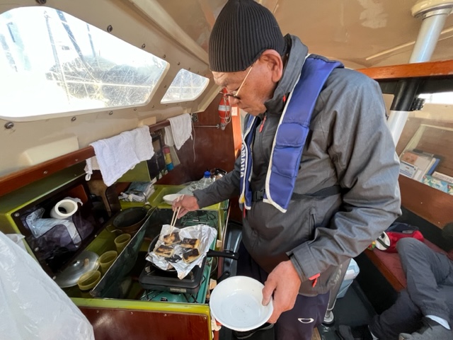 マリーナに戻ってからは、ワンポンの確認後、児玉さんがご自宅の餅つきマシーンでついた餅をあほうどりで焼いてくださりいただく。ヨットの上でのこうした過ごしかたは最高。