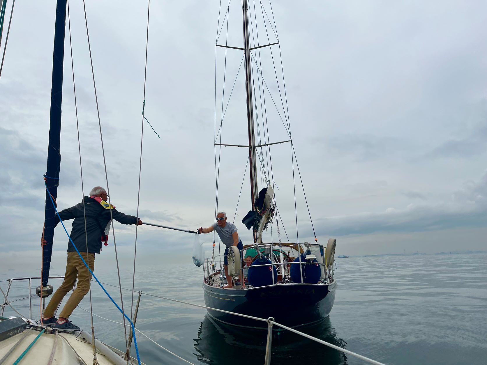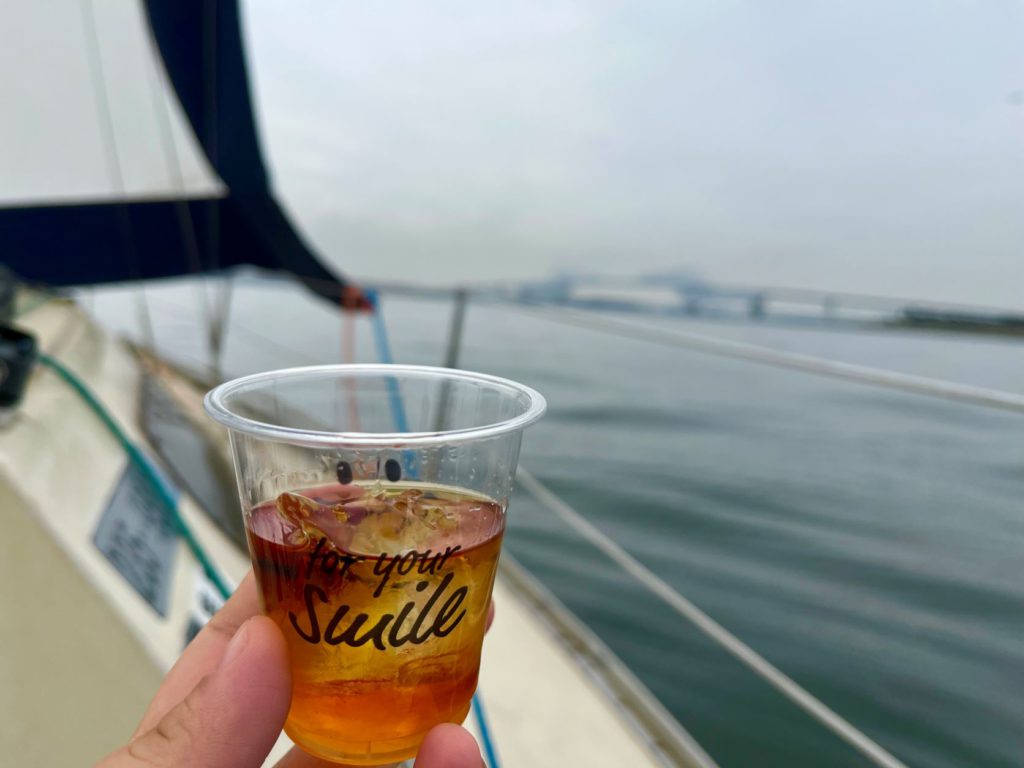 天候は、Bacchusを知る人なら納得するであろう曇り空。風もジブセールが機能しない無風に近い状態。終始メインセールのみで機帆走にていろんなところを行ったり来たり。途中で仲間の船を見つけてボートフックで相手艇の人に喜ぶ飲み物をお裾分け。