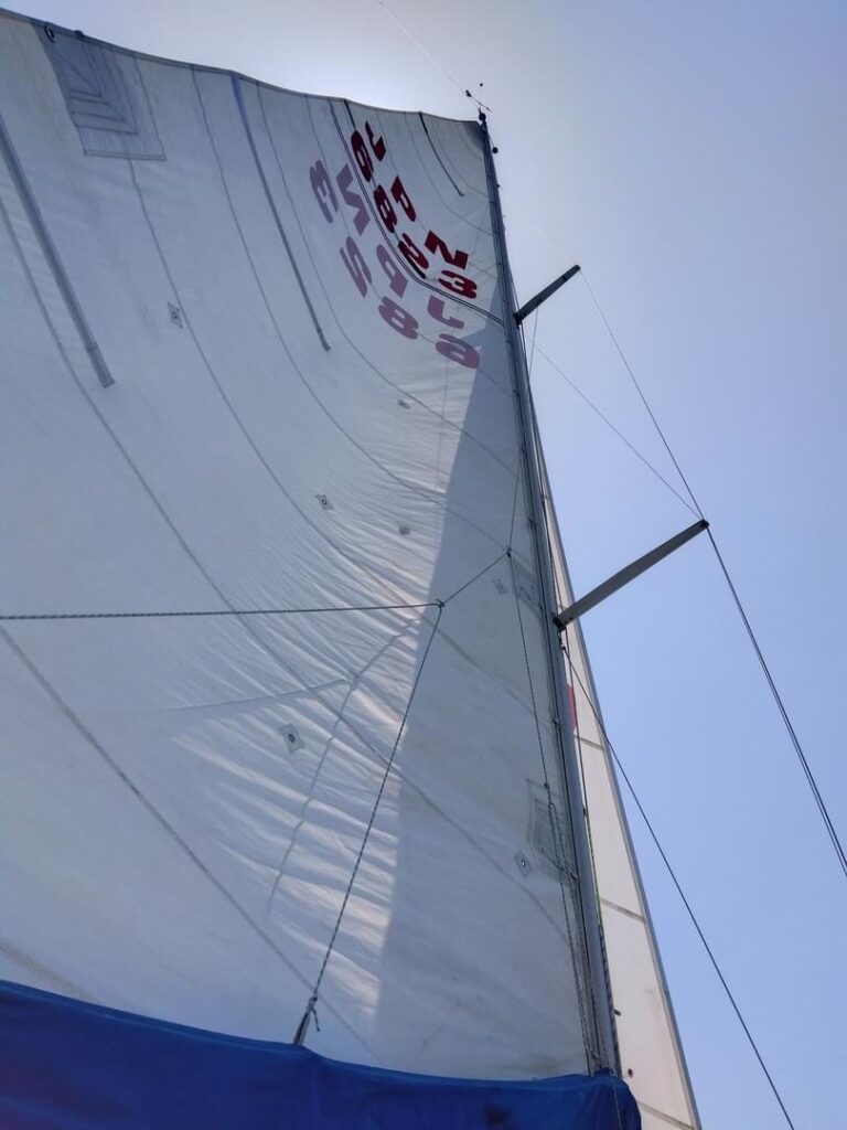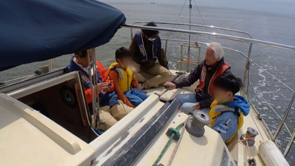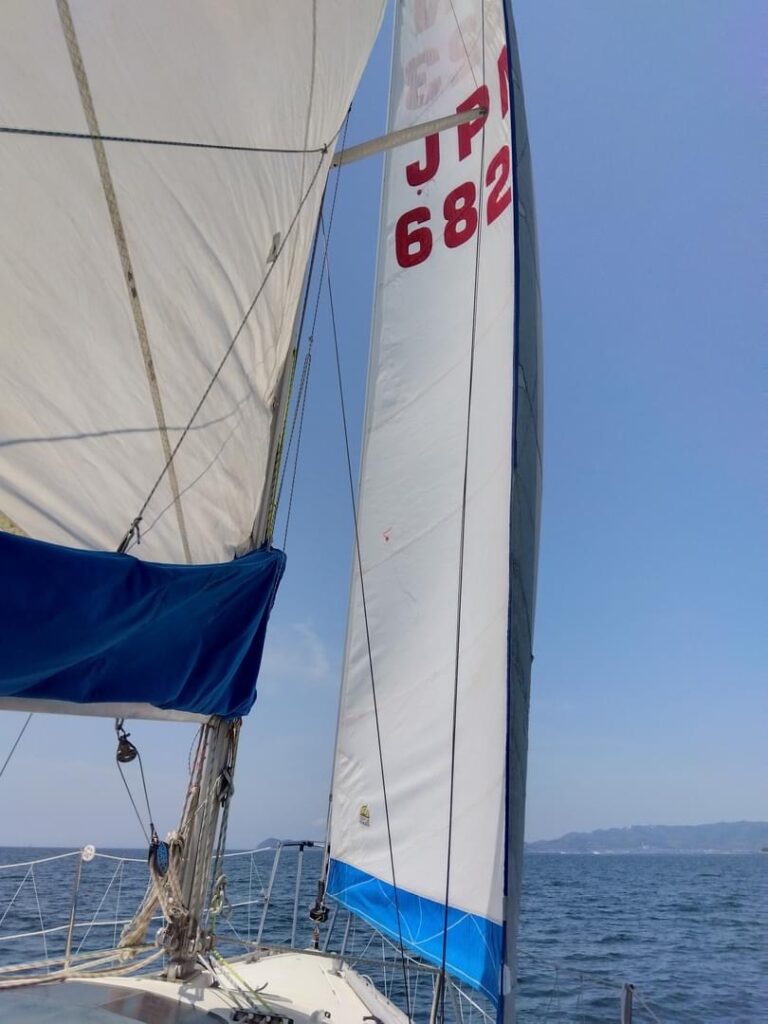 本日は今シーズン初の「ASUKA」でのセイリングを行いました。初夏の爽やかな陽ざしのもと、出航すると、マリーナを出る手前で、スナメリと遭遇。クルージングへの期待がぐんと高まる。微風で海面はとても穏やか。池谷さんの指示で、山田(剛司)さんと森崎がティラーを操作しました。