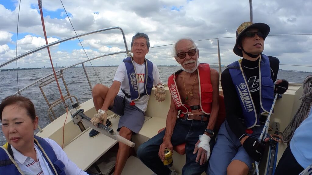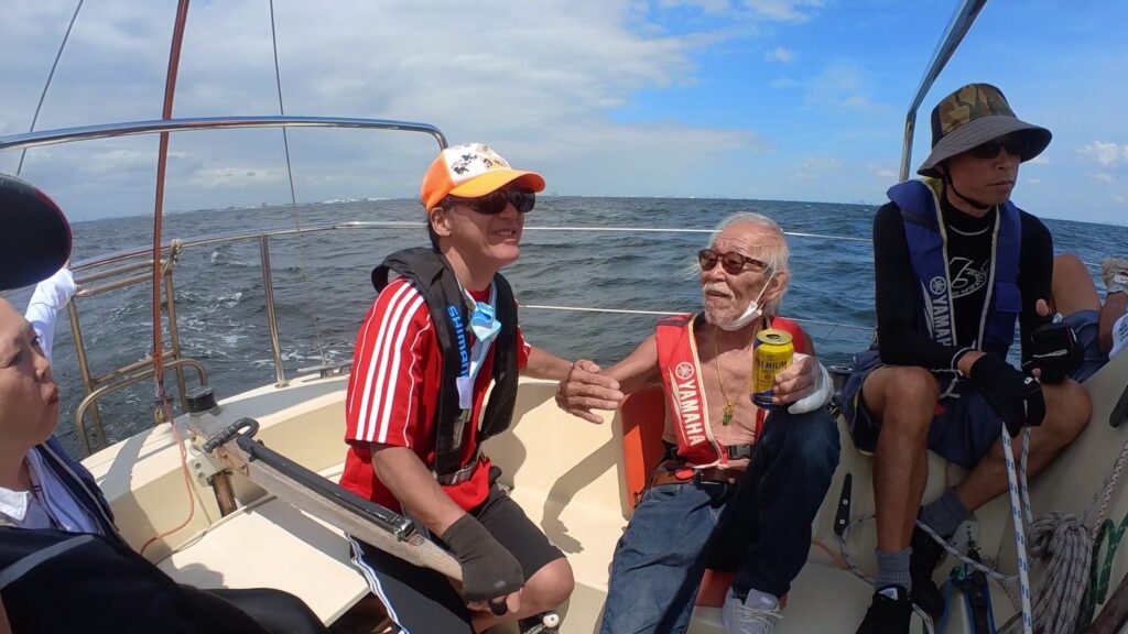 即、ジブセールも貼りました。ティラーは体験者さん。玉木さんはスタンでウォッチ。副田さはミジップでウォッチ。谷下田さんは優しく?優しく?スキッパーとしてティラー操作をアドバイス。それが驚くほど直進が安定していまして。初めてとは思えないほどの腕前です。レースチーム方々からのスカウト必至です。お伺いしたところブラインドゴルフもされており才能と活動力は賞金女王以上なのです。今後ともよろしくお願いします。