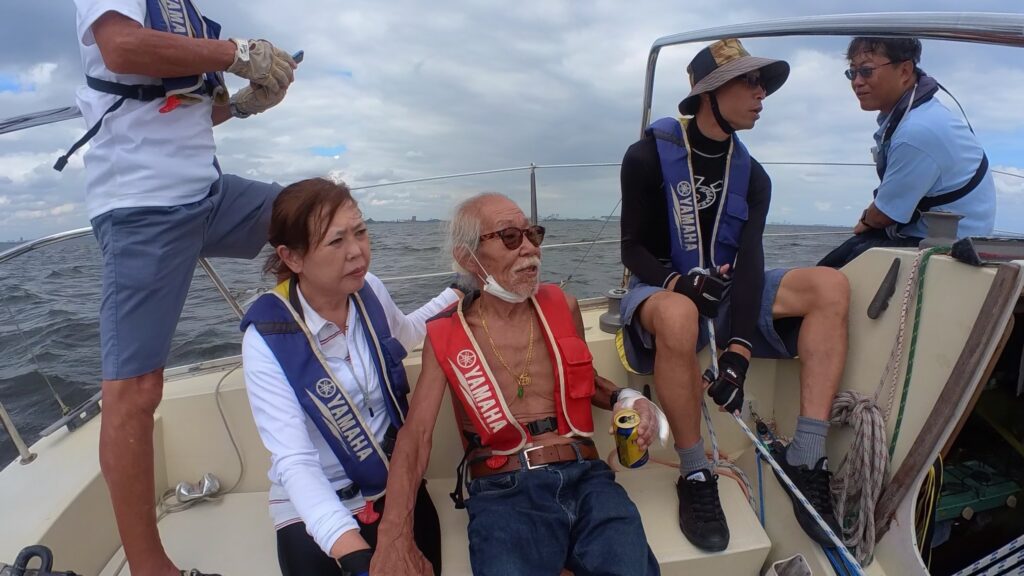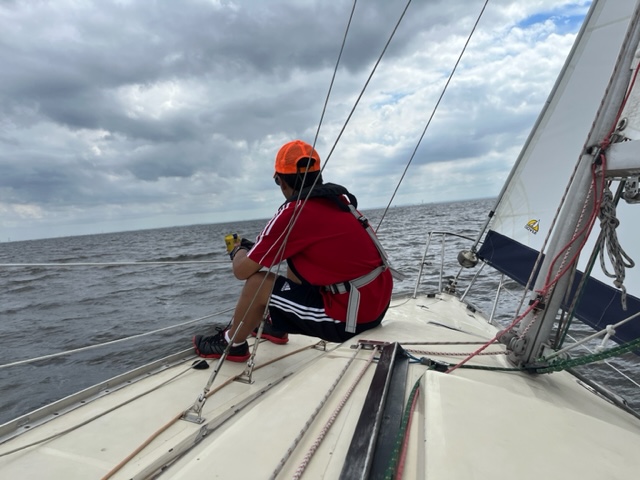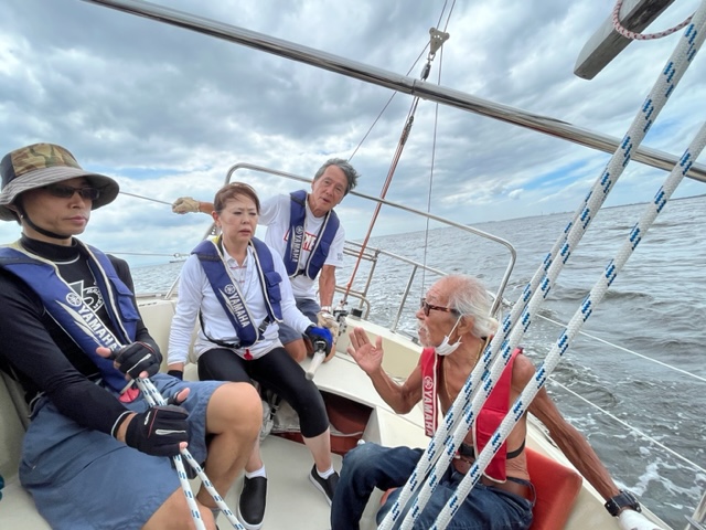 沖のポイントまで来ました。早めのハリヤードアップ、メインセールを貼ります。体験者さんと息を合わせ空高々とつきあげました。