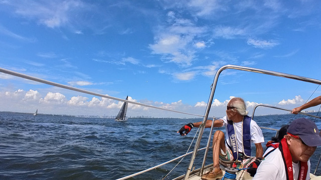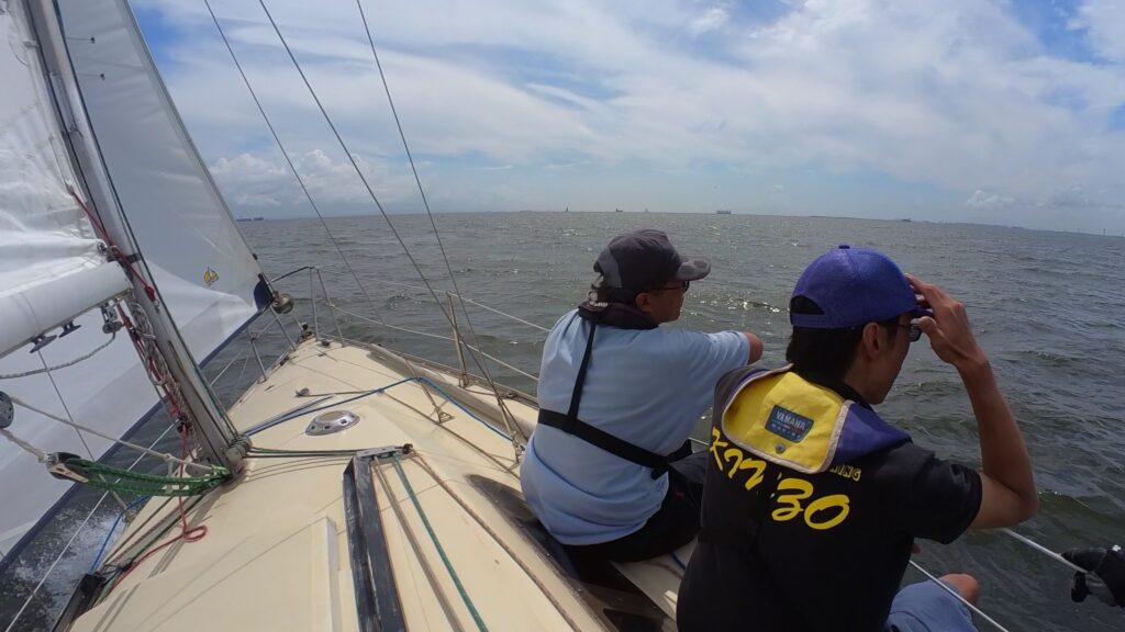 「サイテッドにティラー代わってください」という、ミジップにいたそえださんの声で交代。左舷のすぐそばを、ヨットが前からきてすれ違っていった。