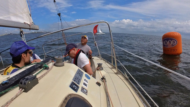 それでも明らかに厳しいエリアに入ってこようとしていたので、堀江さんに「ノールーム!」と、ごく普通に指摘されたのち、最後には、「タックしないとぶつかるよ」という、まるで相手艇のクルーのようなトーンで伝えられ、右舷にいた艇は本部艇ぎりぎりで急ブレーキして回頭。