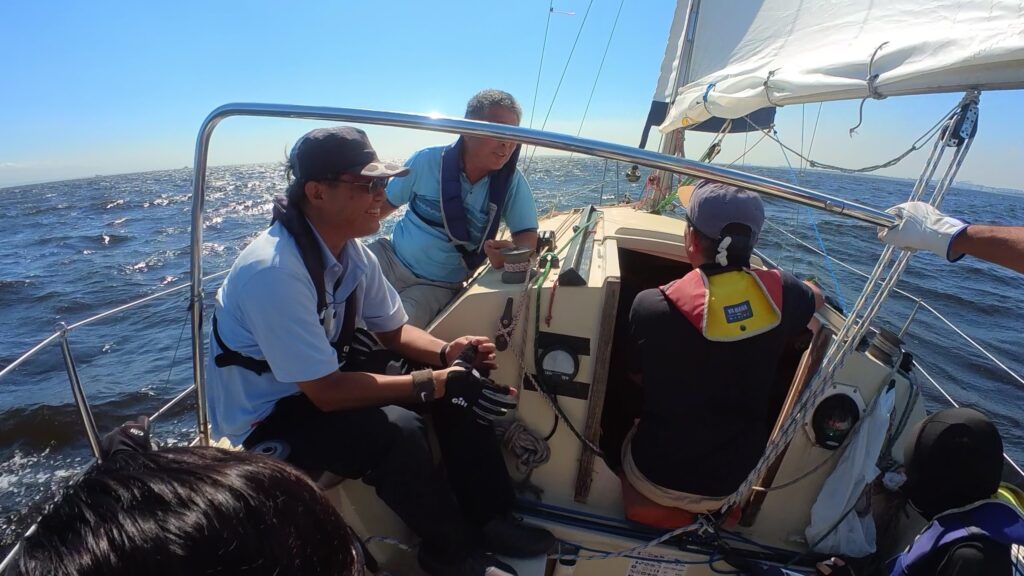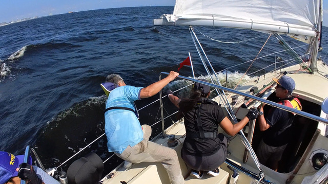 最後は荒木さんが、あのダンブイは持ち帰りたいと再び操船するが、どうにもマニュアル通りうまくいかない。結局、メインやジブも調整しながらなんとか回収した。