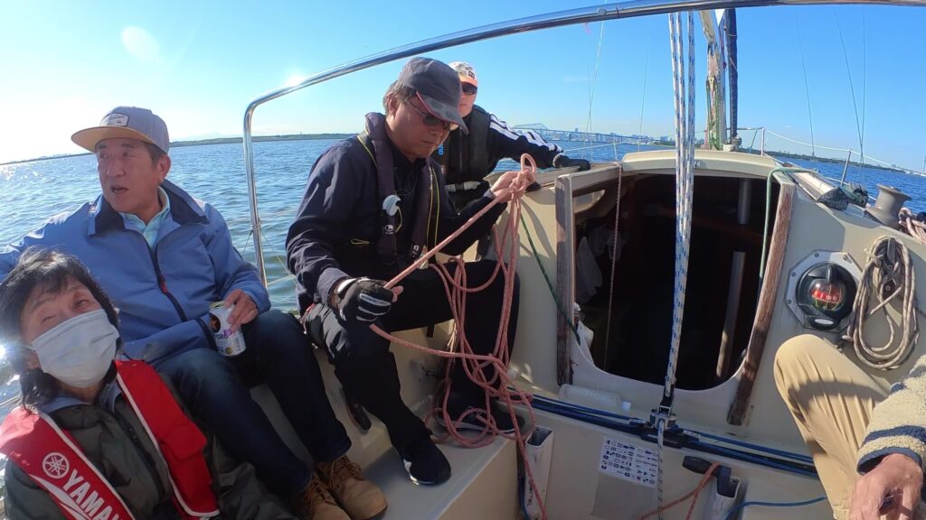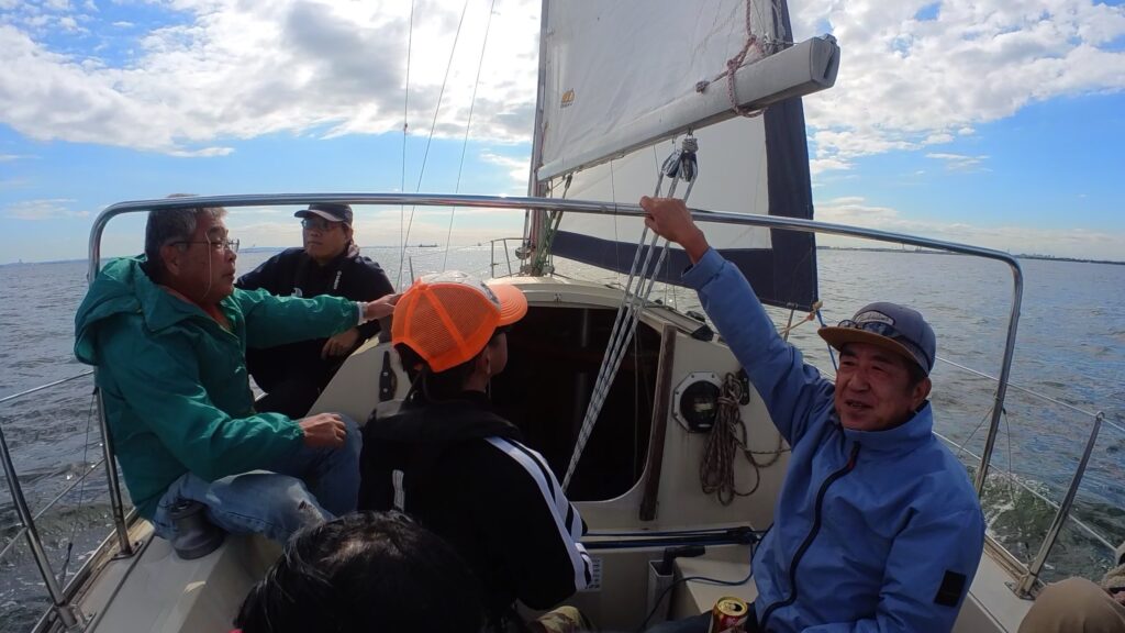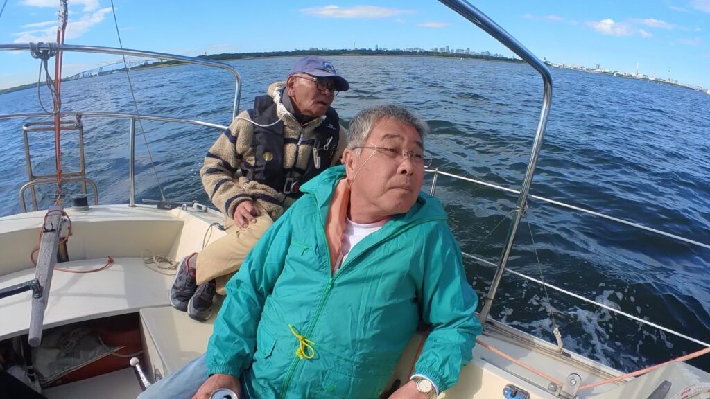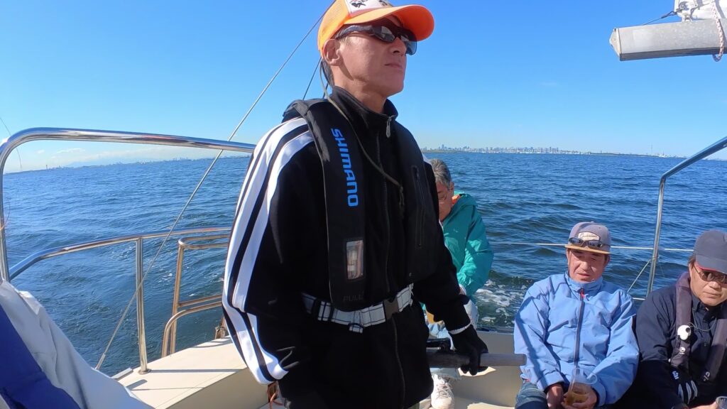 今日のメンバーはサイテッドとブラインドも私以外ベテランばかりなので安心して宴に挑むことができます。一杯飲み干したあたり、まだ若洲沖手前ですがメインセールを上げます。風は上々、波は40cm程度とてものんびり、演出上手東京湾クルージング。秋風も心地良い日にあったセーリングです。