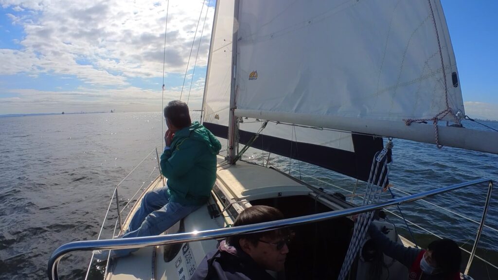 若洲沖を抜けジブセールも貼ります。南東から吹いてくる風、クローズからティラー小倉さんスタート。スキッパーは児玉さん。自然とレースモードに変わります。呼吸を合わせただけでトップスピード8ノット。私もメインシート操作させていただきました。メインシートはルミナスでアルバの皆さんから教えていただいたばかり。風をセールに送り込み逃がしていくことでスピードが出ます。わずか1cmの出し入れで1ノット以上向上しました。殿垣内さんの繊細なアドバイスありがとうございます。