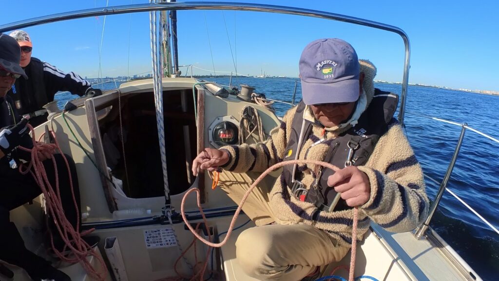 夢の島マリーナに近づきジブシートの交換を児玉さんと殿垣内さんが行ってくださいました。左舷右舷のシート、両方オレンジ色になります。軽くて丈夫最高です。