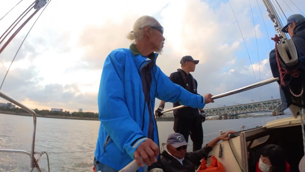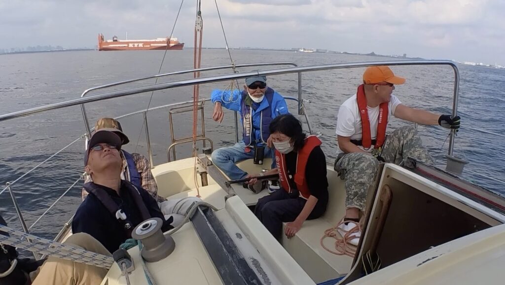 永井さんが発見し、児玉さんが確認されて、デスマストする可能性があるため、即メインダウンせよとの指示。ついで、ジブもダウンするようバウから指示され、これまで数えきれない回数、こうした作業を、強風下などでもおこなってきたおかげで、適切に対応でき、本当によかったと思った瞬間でした。
