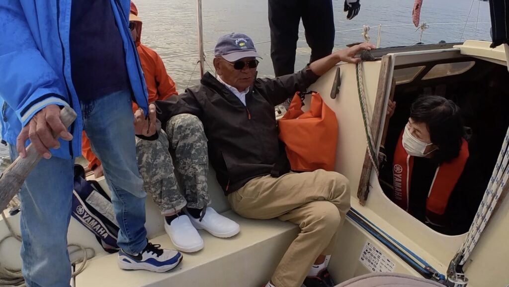 帰路、走るあほうどりの上でみんな楽しくワイワイやっている間、私はひたすら各種ロープを片付け、メインセールをひとりでたたみなおし、セールカバーもつけ、よしよくやったと思いコックピットに戻ると、前述のようにまだ谷下田さんがそえださんを評価しているので、