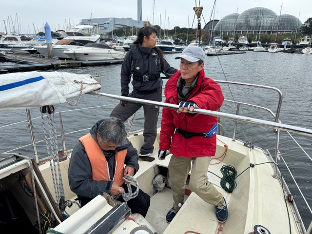 雨もすっかり上がり、若洲沖を目指します。東京湾は、ヨットの数も少なく釣船を数艇交わした後、広い海まで移動します。安全確認後、メインセール、ジブセールを上げました。引き続きへルムスパーソンは玉木さん。スキッパーはミジップにいる永井さんです。永井さん号令のもとタック&ジャイブを繰り返します。殿垣内さん曰く「菱形の走行経路」をイメージし、レース想定。上マーク下マーク回航になります。するとそこでハプニング‼古庄さんのズボンが床面にずり落ちました。ズボンのゴムものんびりゆったりされた様子です。「副田さんは見ちゃダメだよ。」と、古庄さんキャビンでお直し。失礼しま〜す。