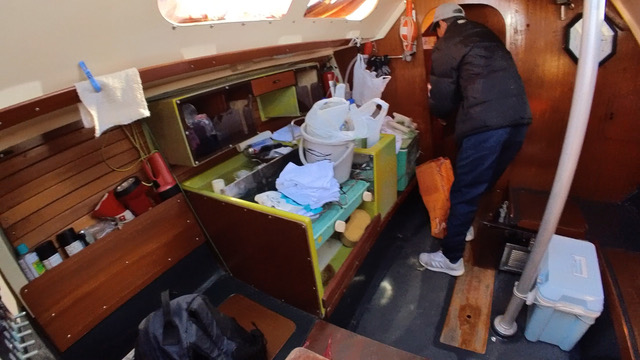 みんな気づいていないかもしれないと私は思っているのだが、実は竹内さんが、細かいものから重たいものまで、ポンツーン側で、あっちへ運びこっちへ戻しとお手伝いしてくださった。本来なら、皆が働く様子をゆっくり座ってご覧いただくぐらいとすべきなのに、これもお願いします、あれもお願いしますと、私は無礼にもヨットの上からどんどん竹内さんに渡していた。