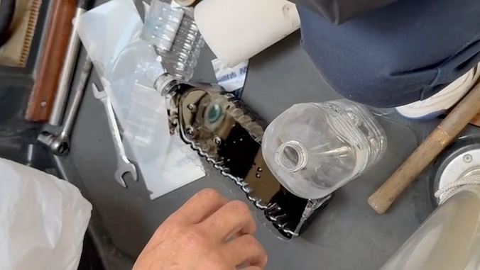 まず、エンジンオイルを抜く作業。よし!と思ったのも束の間、硬くてボルトが回りません。ここが1番の難所でした。パイプをかましてテコの原理を使うも、びくともしません。戦うこと約10分、やっと回りました。急いで、いいサイズに切ったクリアファイルをスロープにし、加工したペットボトルに流しこみました。